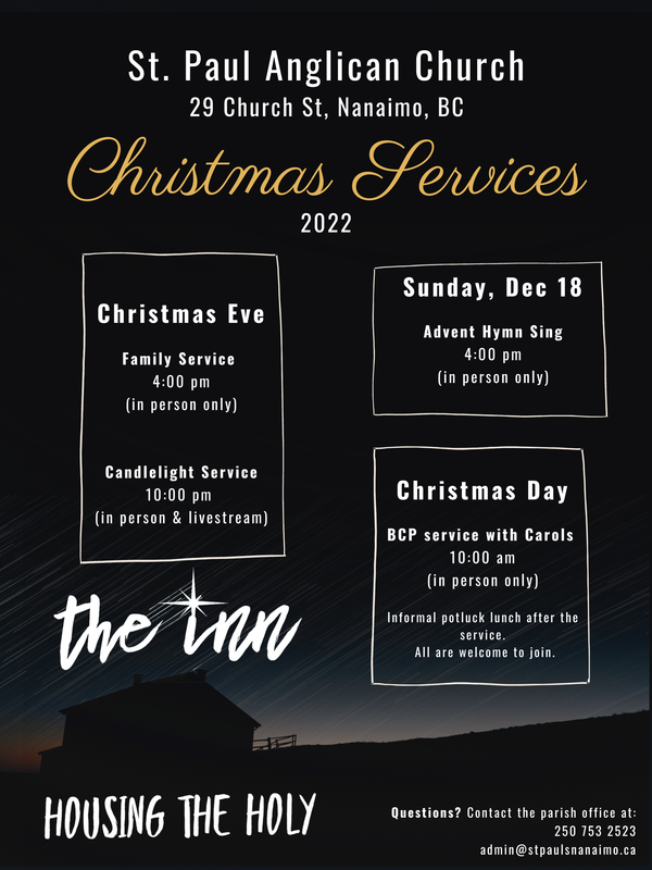 This year our Christmas Eve Services are Saturday, December 24 with a 4 pm Christmas Eve Family Service and then a 10 pm Candlelight Service The late service will be livestreamed and also available afterwards to watch at your leisure by going to our website: www.stpaulsnanaimo.ca.